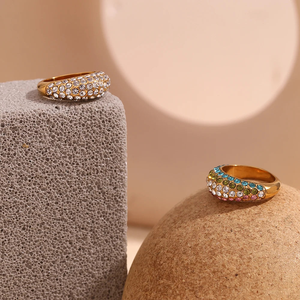 C’est l’équilibre parfait entre brillance classique et touche audacieuse. Pavée de strass scintillants, elle est disponible en deux versions : une purement cristalline, élégante et intemporelle, et une autre multicolore dégradée, vibrante et moderne. Son design bombé donne du volume à votre main tout en captant la lumière sous tous les angles.