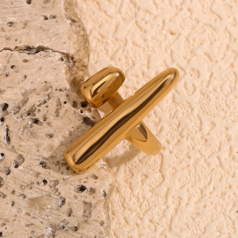 Thelma impose une silhouette graphique forte avec ses deux formes dorées allongées qui se croisent en un point d’équilibre parfait. Sa structure ouverte et son volume sculptural captent instantanément le regard, tout en conservant une grande élégance.