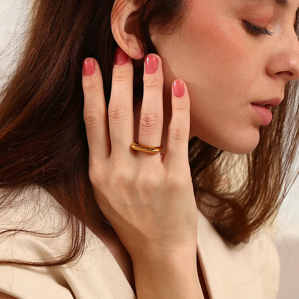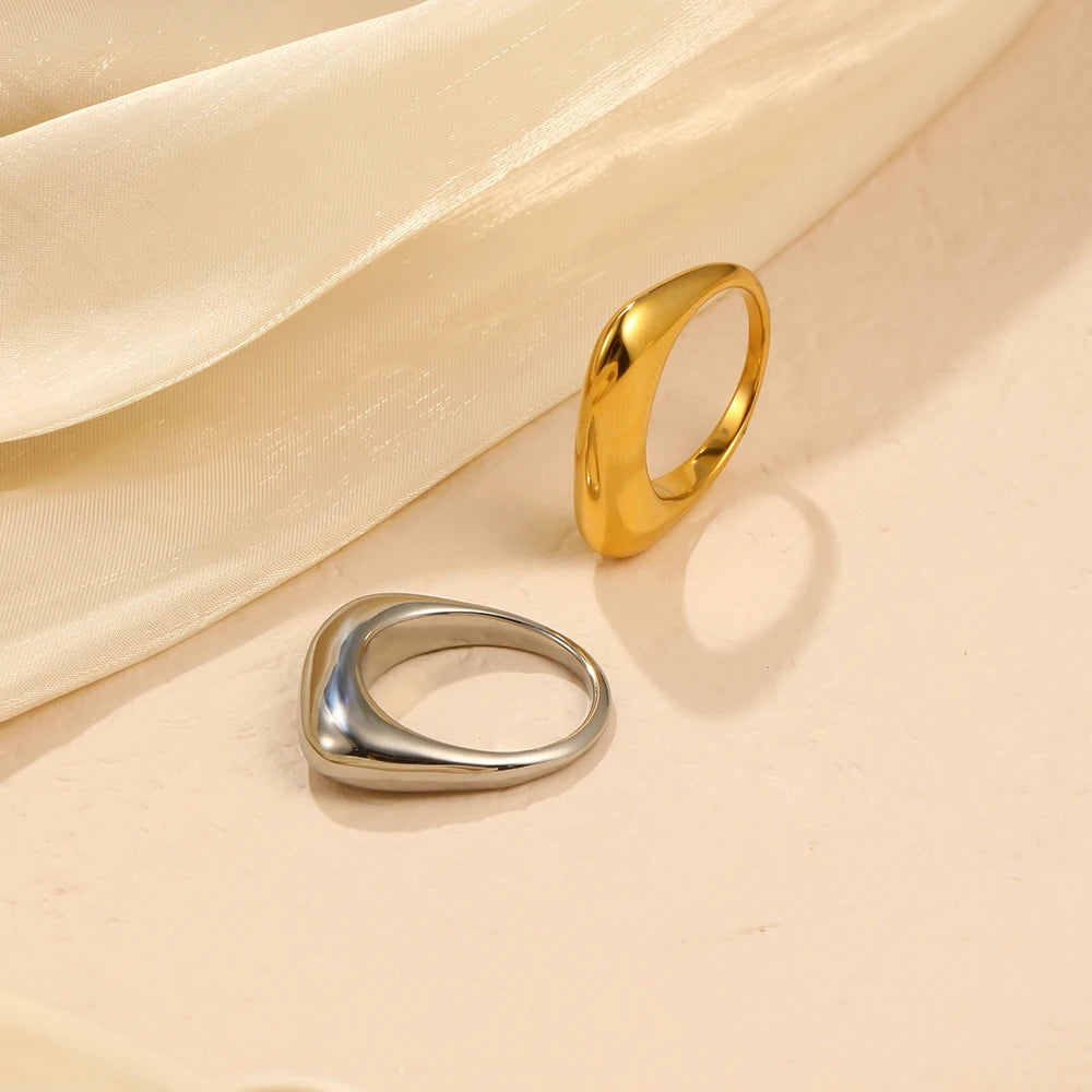 Purity and character come together in the Denise ring. Its slightly flattened and rounded silhouette adds a sculptural touch to this boldly designed piece. Available in gold and silver, it captivates with its structured minimalism. Its modern, architectural style makes it a statement piece with understated style.