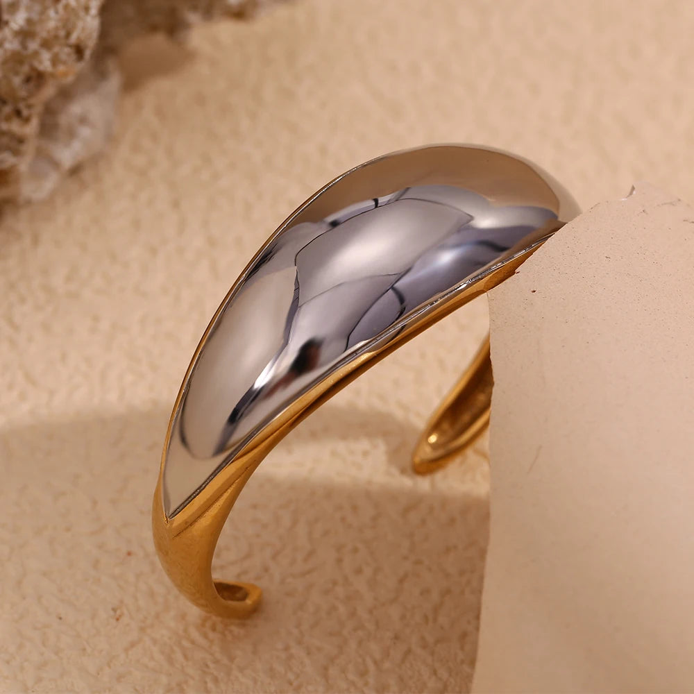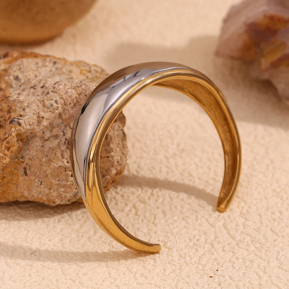 The Ayo bracelet fuses gold and silver in a bold, minimalist crossover design. Its open shape fits perfectly on the wrist, while its luminous contrast draws the eye without ever stealing the show.