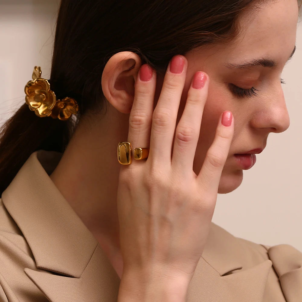 Bold and sculptural, Lana plays on volumes and curves. Composed of two golden elements with asymmetrical lines, it powerfully hugs the finger. Its architectural style makes it a strong piece, perfect for elegantly asserting your individuality.