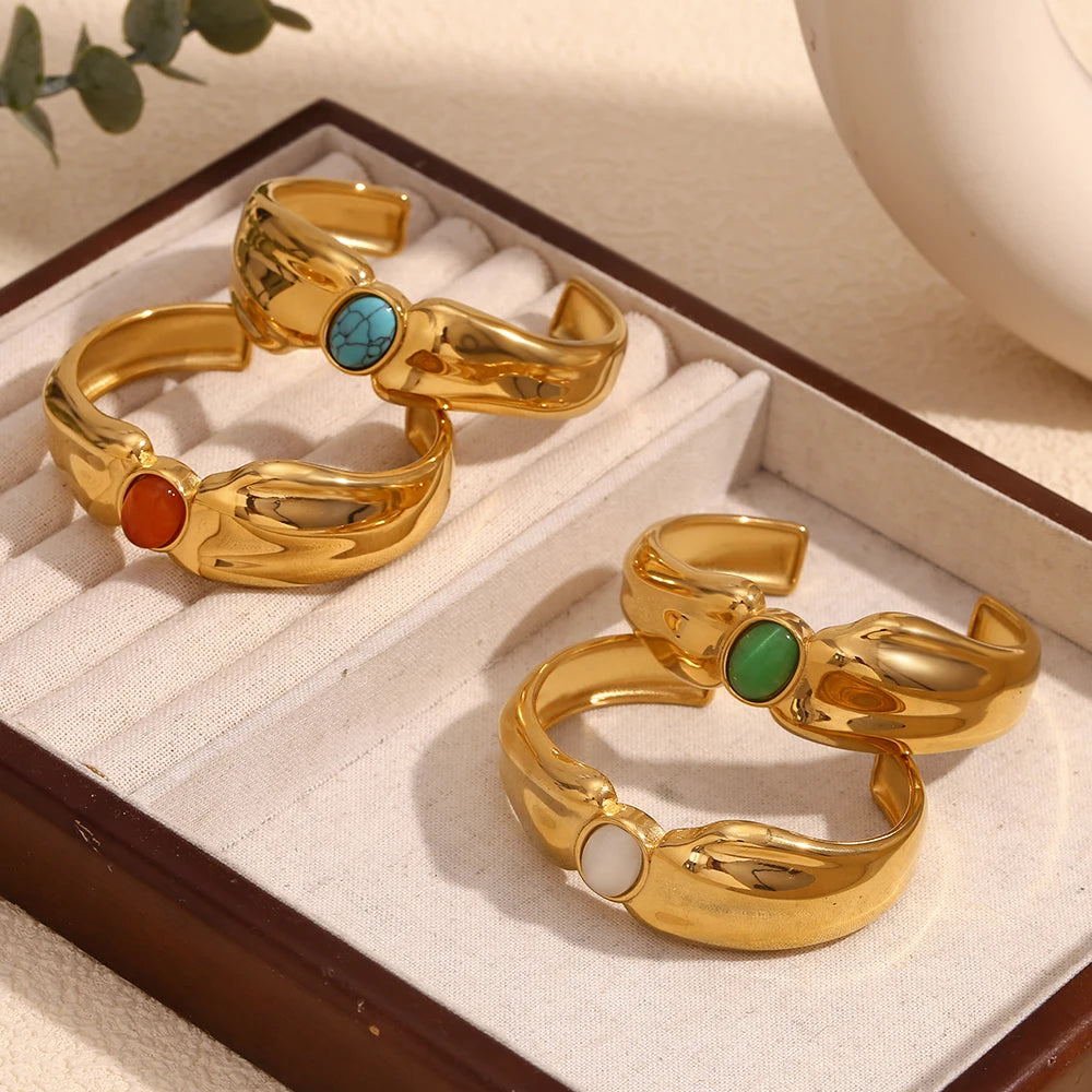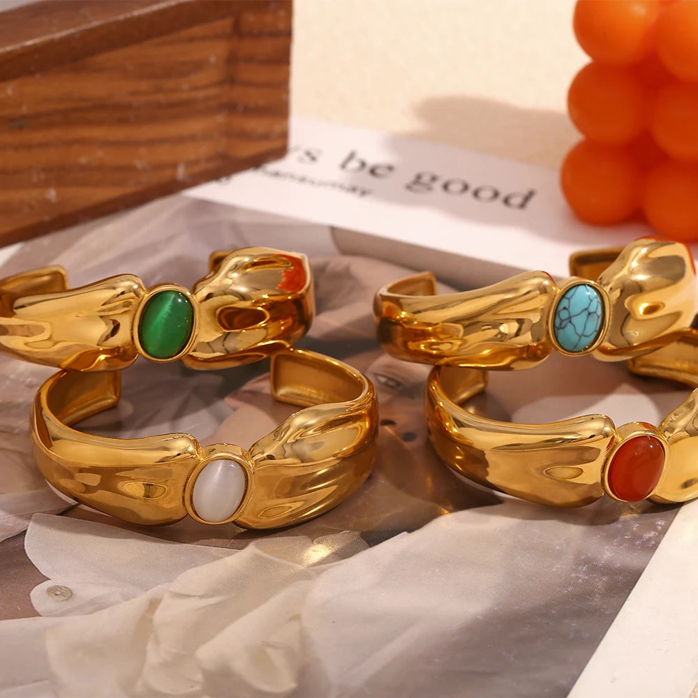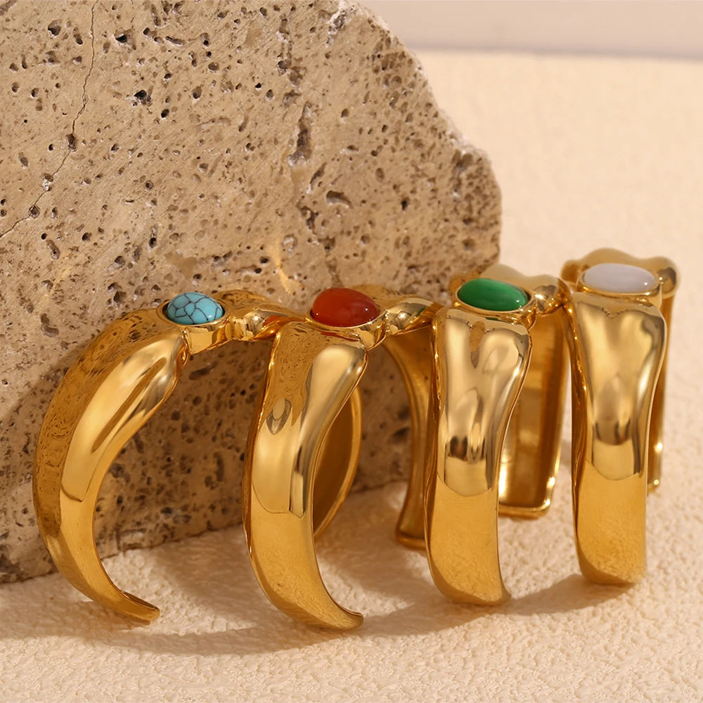 Let yourself be enchanted by Ursul a , a bold bracelet with a sculptural design and a noble allure. Each piece is adorned with a colored mineral stone mounted on a solid gold bangle , for a vibrant and assertive touch to your wrist.