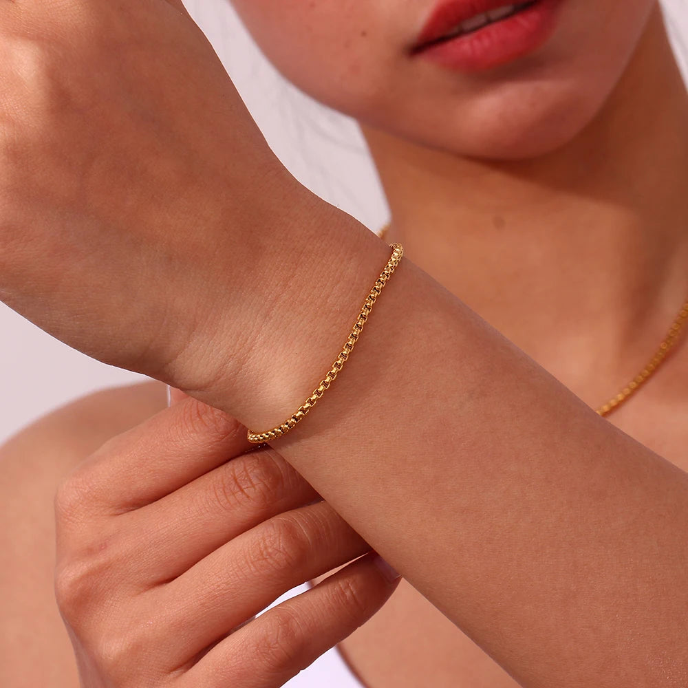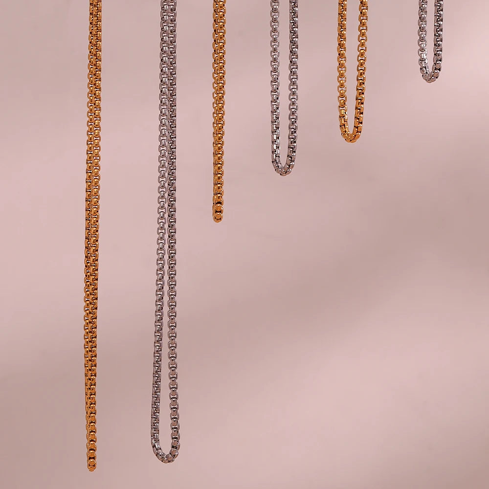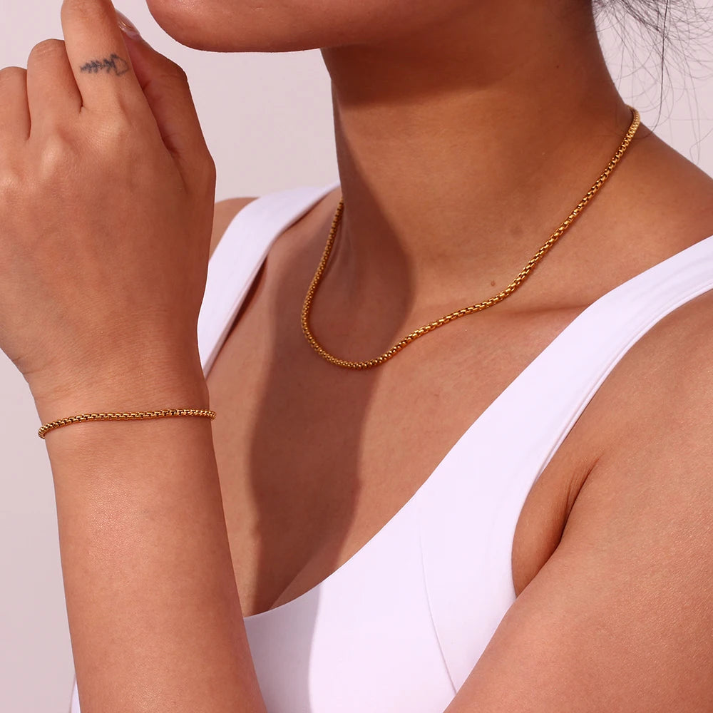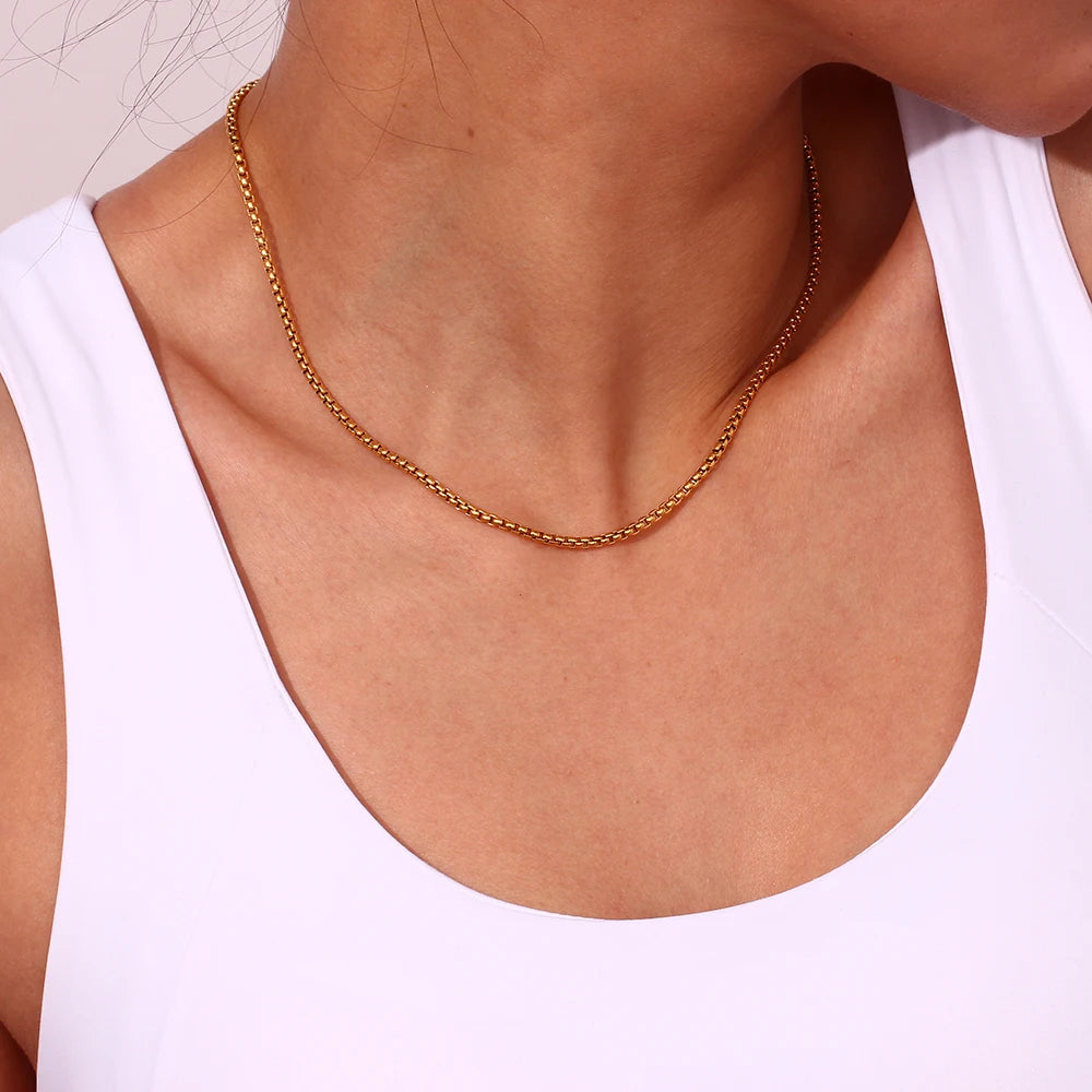 Alex, a fine and structured square chain , both modern and elegant , available as a necklace , bracelet , and anklet . A unisex must-have to wear every day or layered.